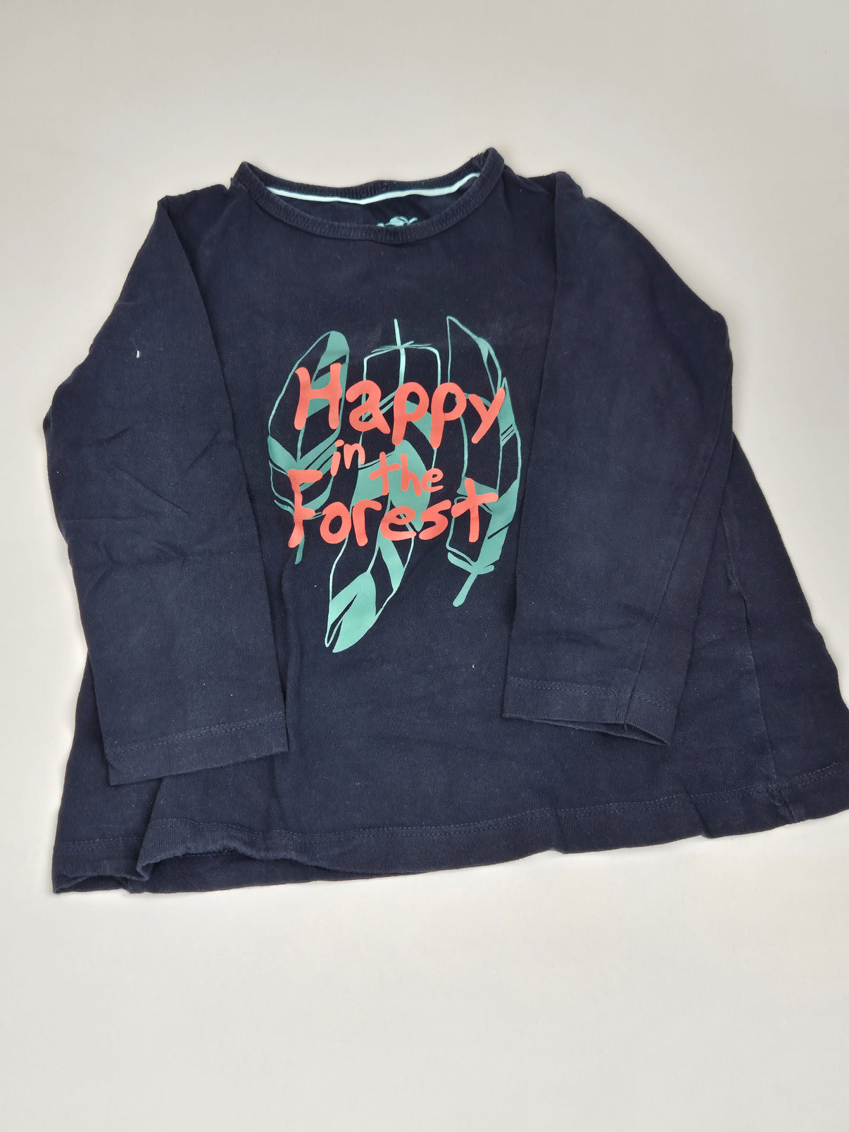 Tmavě modré tričko s dlouhým rukávem od Lupilu je skvělou volbou pro malé dobrodruhy. Potisk Happy in the Forest s listy v tyrkysovém tónu dodává kousku příjemně přírodní atmosféru – ideální na venkovní hraní, do školky i na každý běžný den. Střih je pohodlný a díky delšímu zakončení pěkně sedí při pohybu.