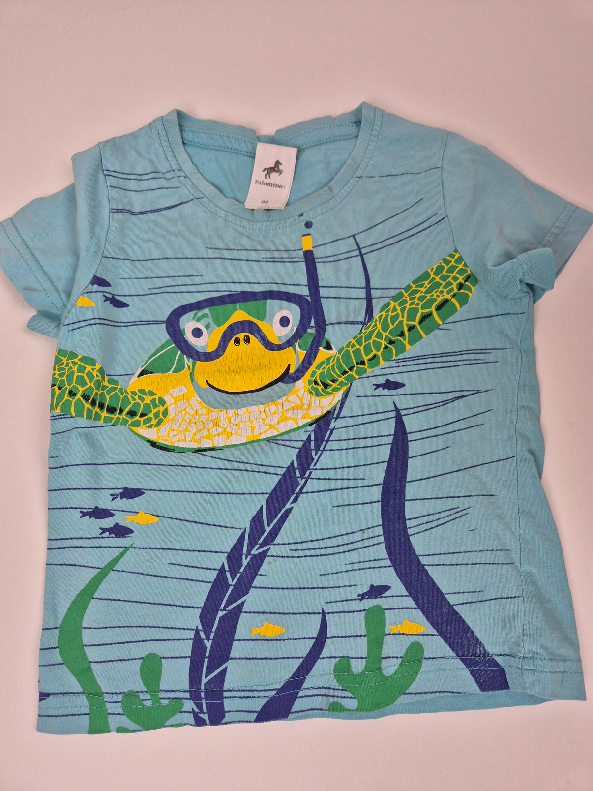 Bavlněné tričko Palomino v jemné tyrkysově modré barvě s hravým potiskem mořské želvy v potápěčských brýlích. Veselý motiv s podmořským světem děti zaujme na první pohled a barvy působí svěže a letně. Příjemný, lehký materiál je ideální na teplejší dny – do školky, na hřiště i na výlety. Krátký rukáv a klasický střih zajistí pohodlí při každém pohybu.