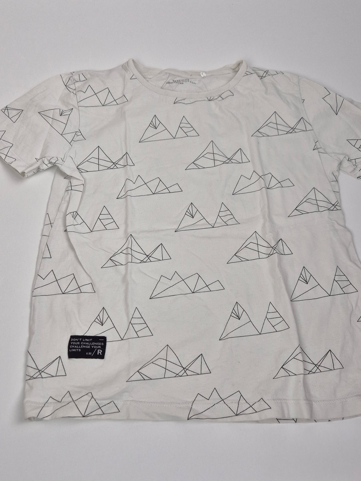Smetanově bílé tričko značky Reserved s jemným celoplošným potiskem stylizovaných hor v černé lince. Světlý, přírodní odstín působí čistě a nadčasově, geometrický motiv dodává tričku moderní a hravý vzhled.