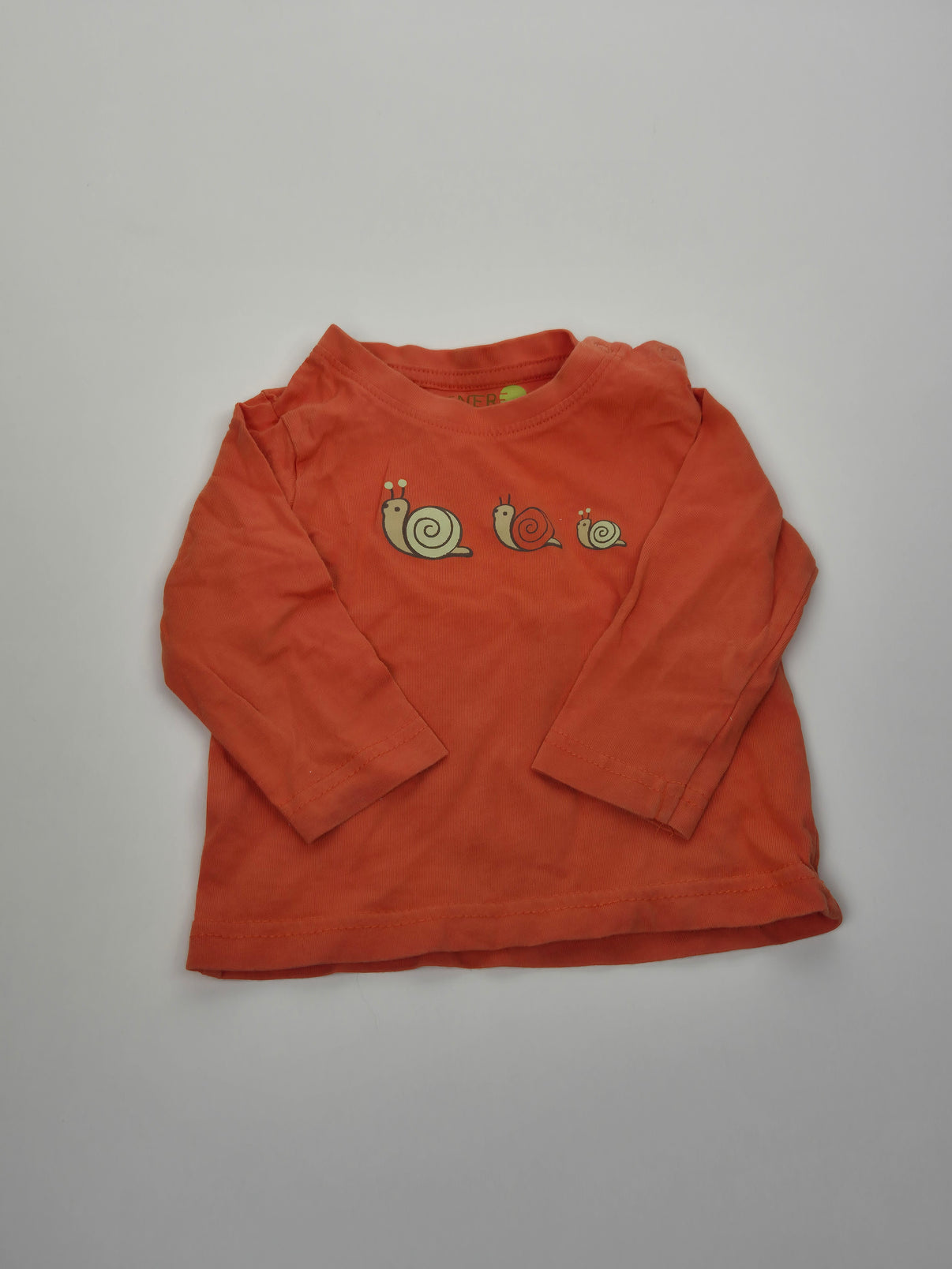 Pohodlné tričko s dlouhým rukávem v teplém cihlově oranžovém odstínu, který krásně oživí dětský šatník. Přední část zdobí milý motiv tří šnečků v přírodních barvách, který působí hravě a zároveň nenuceně. Měkký bavlněný materiál je příjemný na nošení a ideální na každodenní dobrodružství doma, na hřišti i na procházkách.