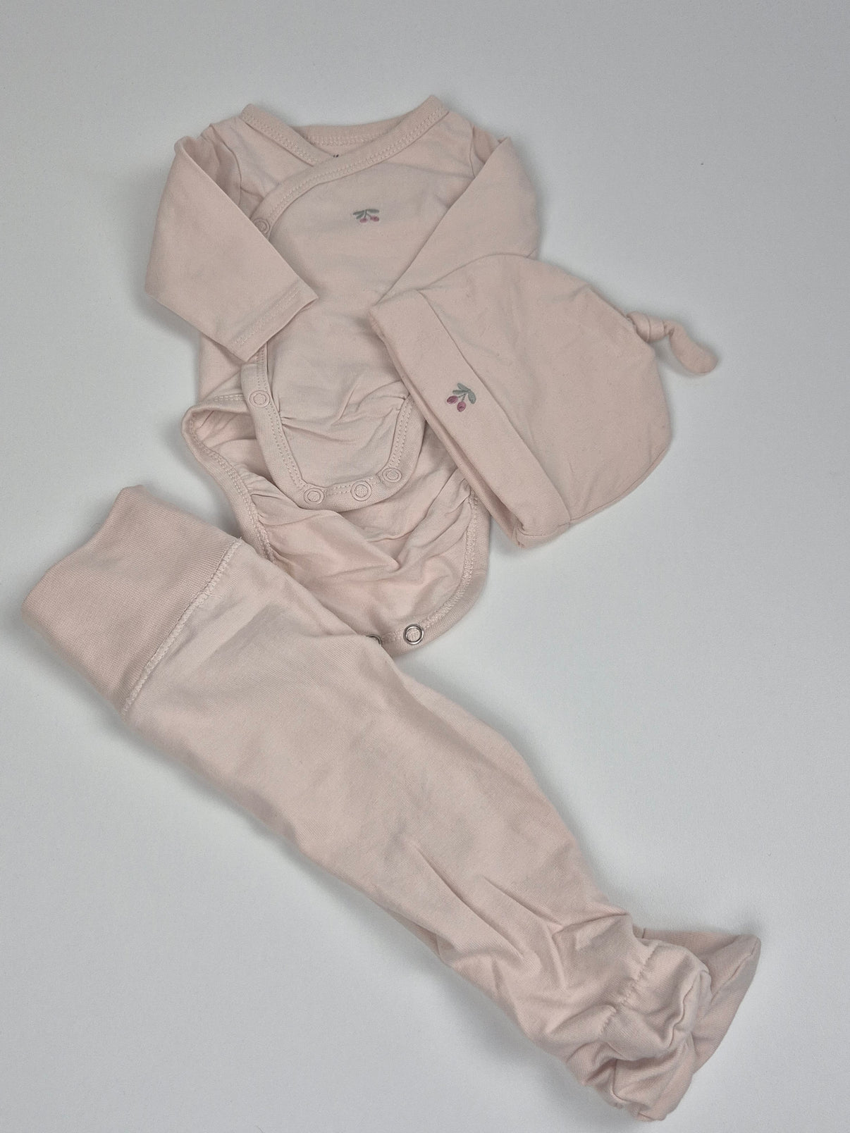 Jemná třídílná sada H&M ve velikosti 50, ideální pro úplně malou holčičku. Set tvoří zavinovací body, pohodlné polodupačky a sladěná čepička. Celý komplet je v něžném pudrově růžovém odstínu s drobnou výšivkou třešniček, která působí roztomile a minimalisticky.
