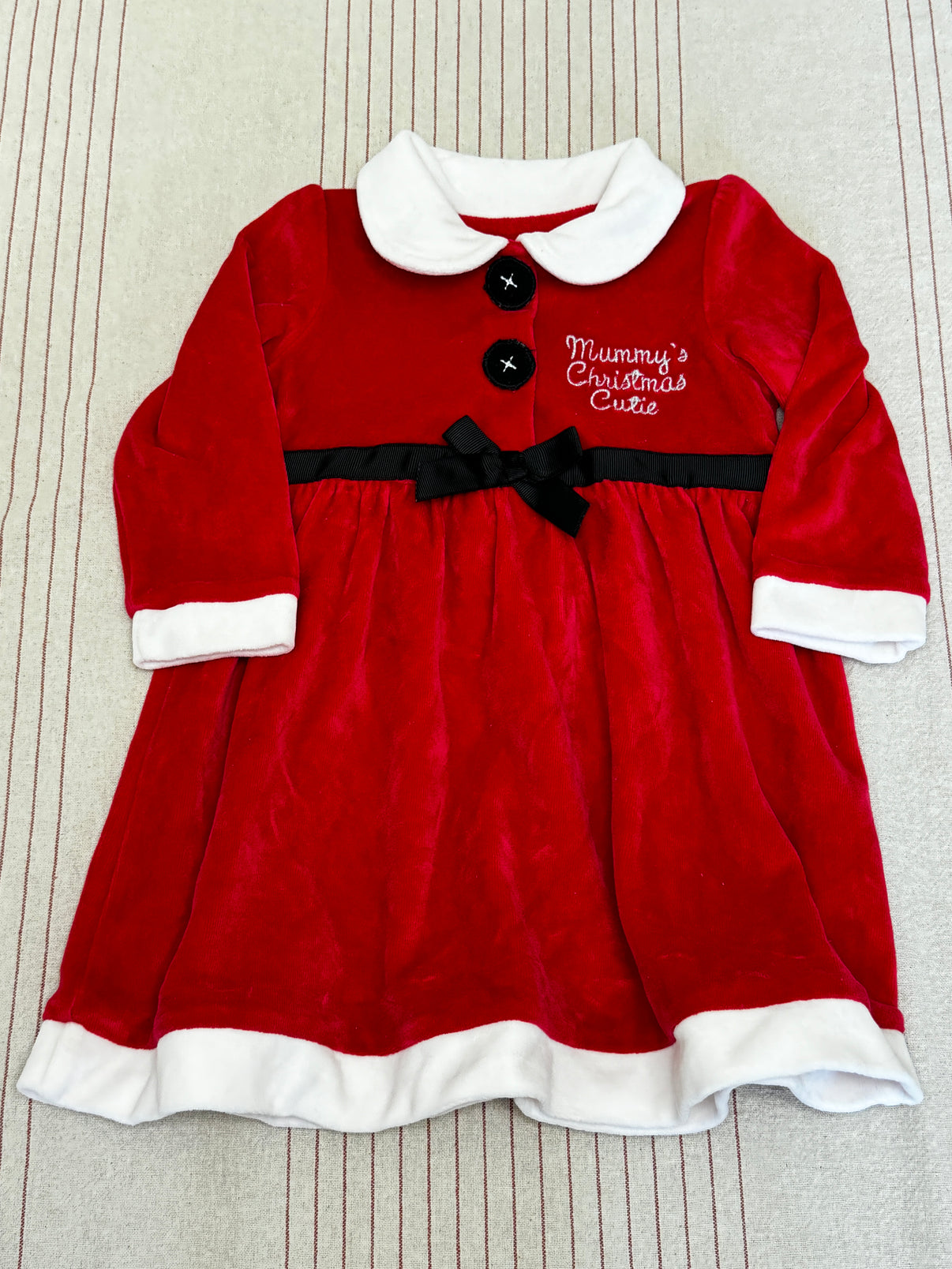 Tyto roztomilé vánoční šaty od značky George ve velikosti 80 jsou ideální pro holčičky ve věku 12-18 měsíců. Šaty v červeném sametovém stylu s bílým límečkem a lemováním evokují pravou vánoční atmosféru. Výšivka „Mummy’s Christmas Cutie“ a černá mašlička podtrhují slavnostní vzhled. Šaty jsou pohodlné a hřejivé, což je ideální pro vánoční oslavy nebo rodinné focení. Skvělá volba pro malé princezny na vánoční čas.