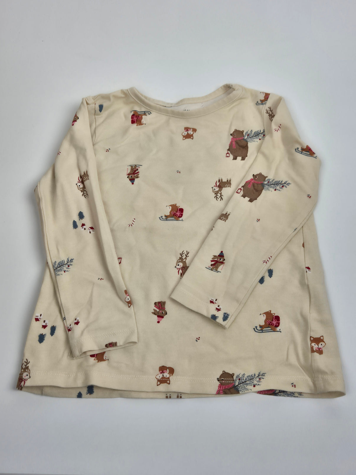 Světle krémové bavlněné tričko s dlouhým rukávem zaujme jemným vánočním potiskem lesních zvířátek na saních, s šálkami a drobnými zimními motivy. Barva je teplá krémová s lehkým nádechem do vanilky, díky čemuž působí tričko měkce a útulně. Materiál je příjemný, pohodlný a ideální na každodenní nošení v zimním období – do školky, na návštěvy i na domácí pohodu během adventu.