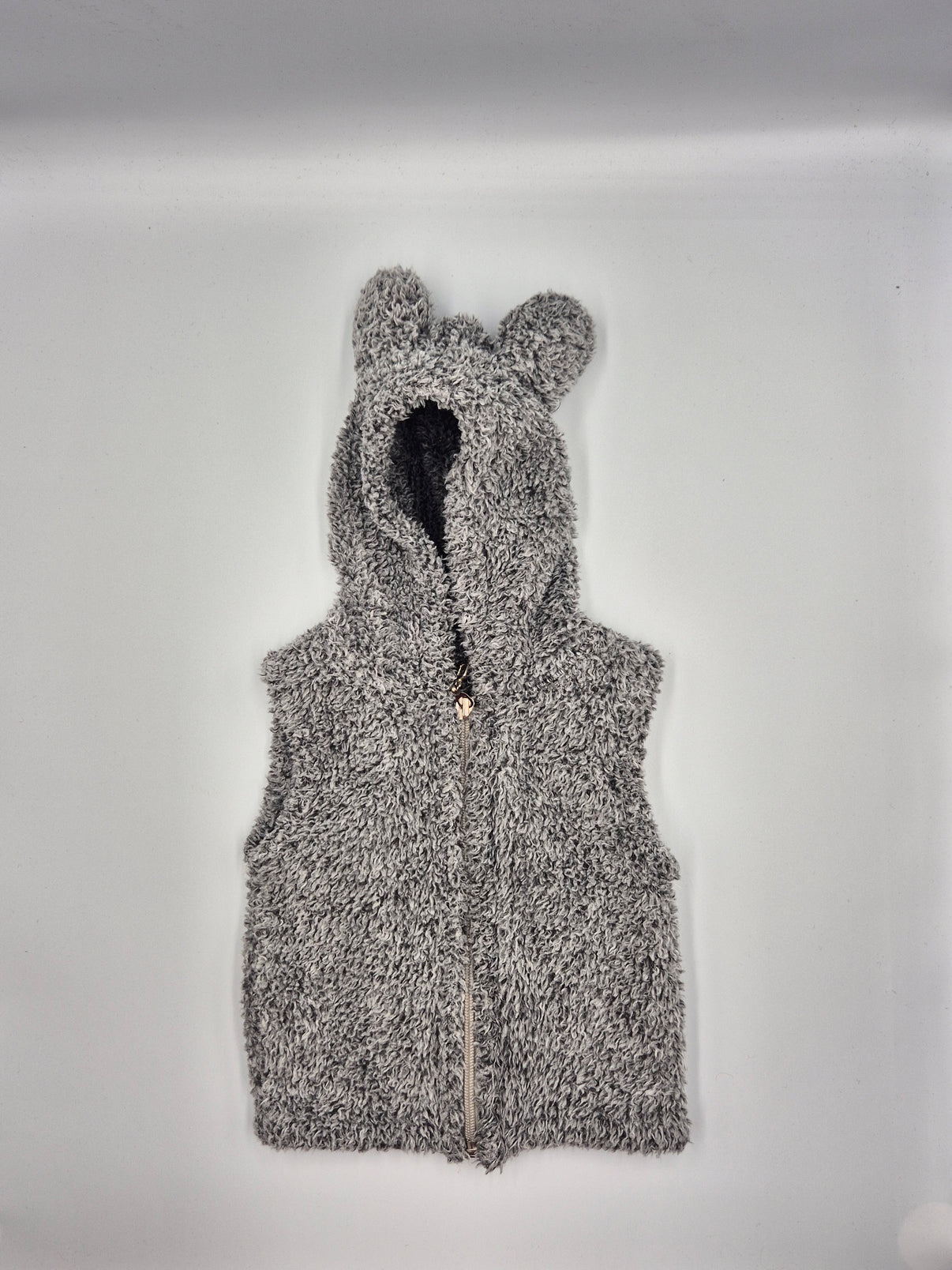 Vesta je v jemném světle šedém odstínu s melírovaným efektem, který působí velmi univerzálně a snadno se kombinuje s barevnými body, mikinkou i tepláčky. Hebký, huňatý materiál zahřeje v chladnějších dnech a je příjemný na dotek. Kapuce s oušky dodává vestě roztomilý vzhled, který si zamiluješ na první pohled.