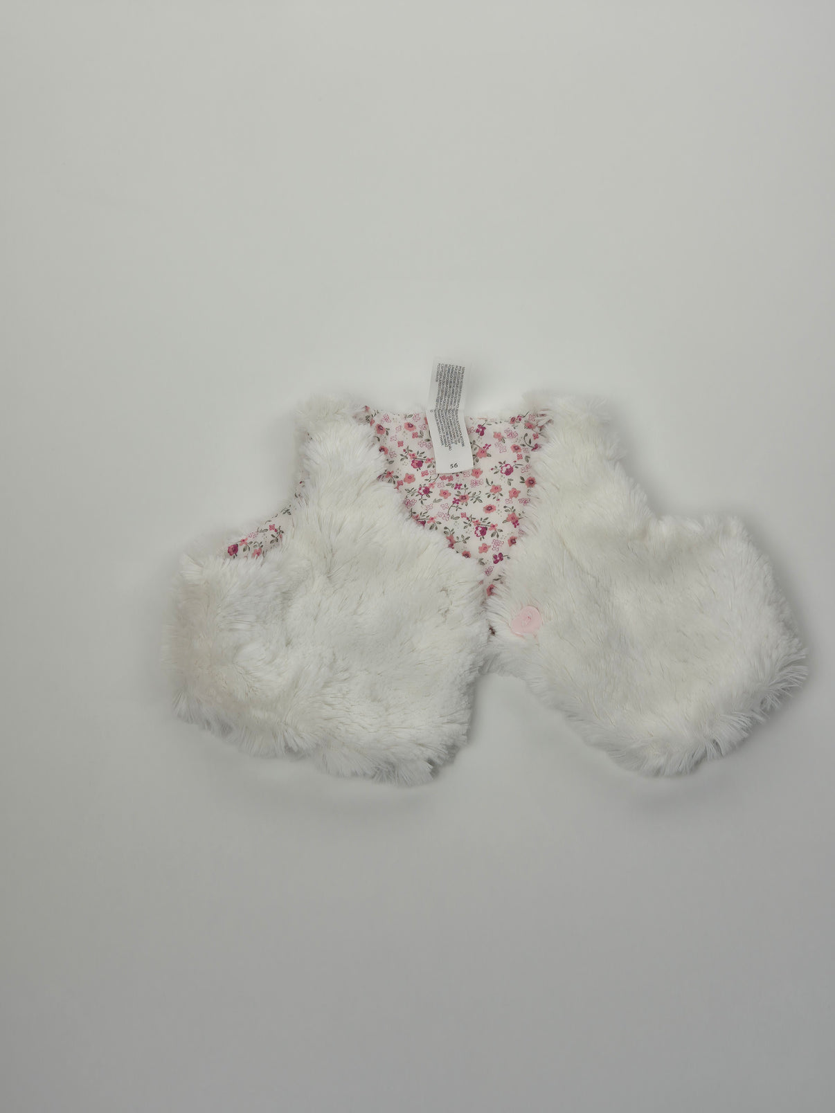 Hebká dětská vestička v jemné smetanově bílé barvě, která na první pohled zaujme měkoučkým chloupkem. Vnitřní strana je s drobným květinovým vzorem v růžových a pastelových tónech, což dodává kousku něžný a holčičí vzhled. Vesta je lehká, příjemná na dotek a ideální jako hřejivá vrstva přes body nebo overálek – doma, do kočárku i na návštěvu. Díky střihu se snadno obléká a miminku poskytne pohodlí i teplo. Vhodná pro holčičku. Značka C&A.