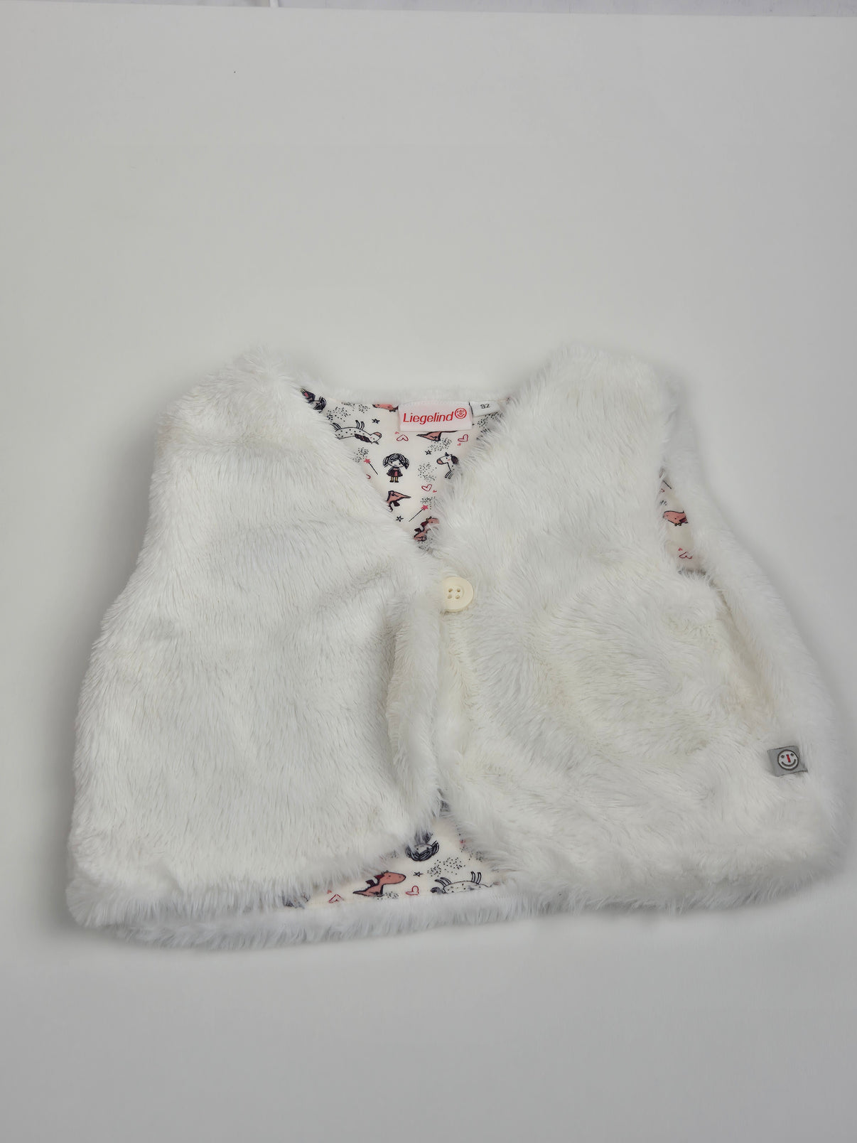 Hebká a hřejivá vesta v čistě bílé barvě z jemného chlupatého (fleece) materiálu, který působí luxusně, měkoučce a velmi příjemně na dotek. Jednobarevné provedení je nadčasové a snadno kombinovatelné – krásně doladí šaty, mikinu i tričko s dlouhým rukávem.