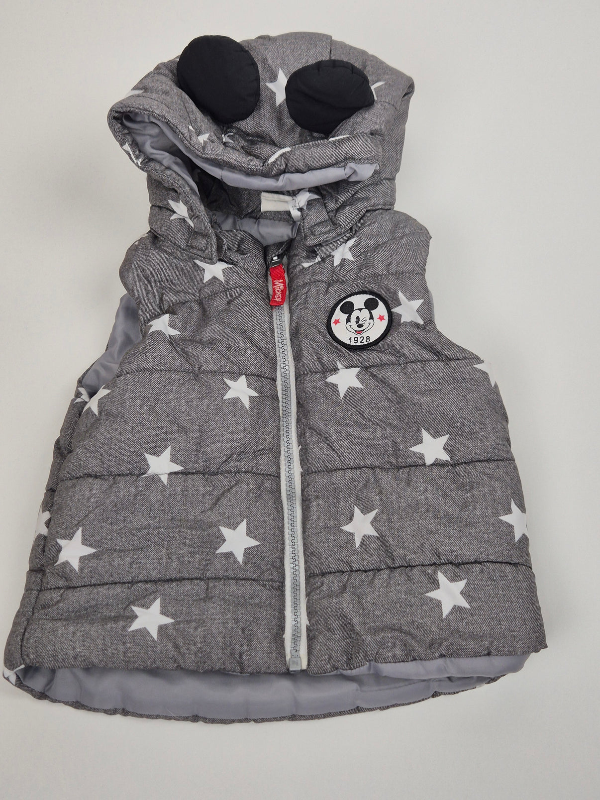 Roztomilá dětská vesta H&M s motivem Mickey Mouse ve velikosti 86 je skvělou volbou na chladnější dny. V šedém melírovaném provedení s potiskem bílých hvězdiček a výšivkou Mickeyho působí stylově a hravě zároveň. Kapuce je doplněná o ikonická černá ouška, což dodává celému kousku kouzelný vzhled. Zapínání na zip s praktickým jezdcem usnadňuje oblékání. Skvělá volba pro holky i kluky na procházky, hřiště nebo cestu do školky.