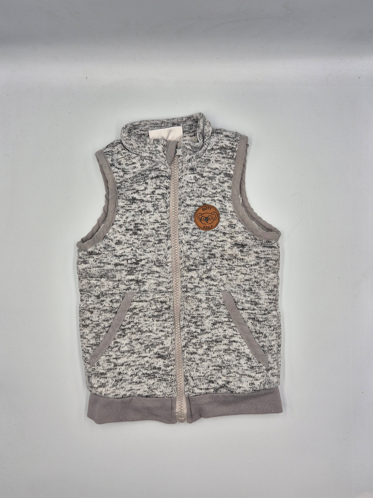 Hřejivá dětská vesta Pepco v šedo-béžovém melírovaném provedení je skvělým kouskem do chladnějších dnů. Přední stranu doplňuje malá nášivka s motivem koaly a nápisem „Happy Koala“, která vestě dodává milý hravý detail.