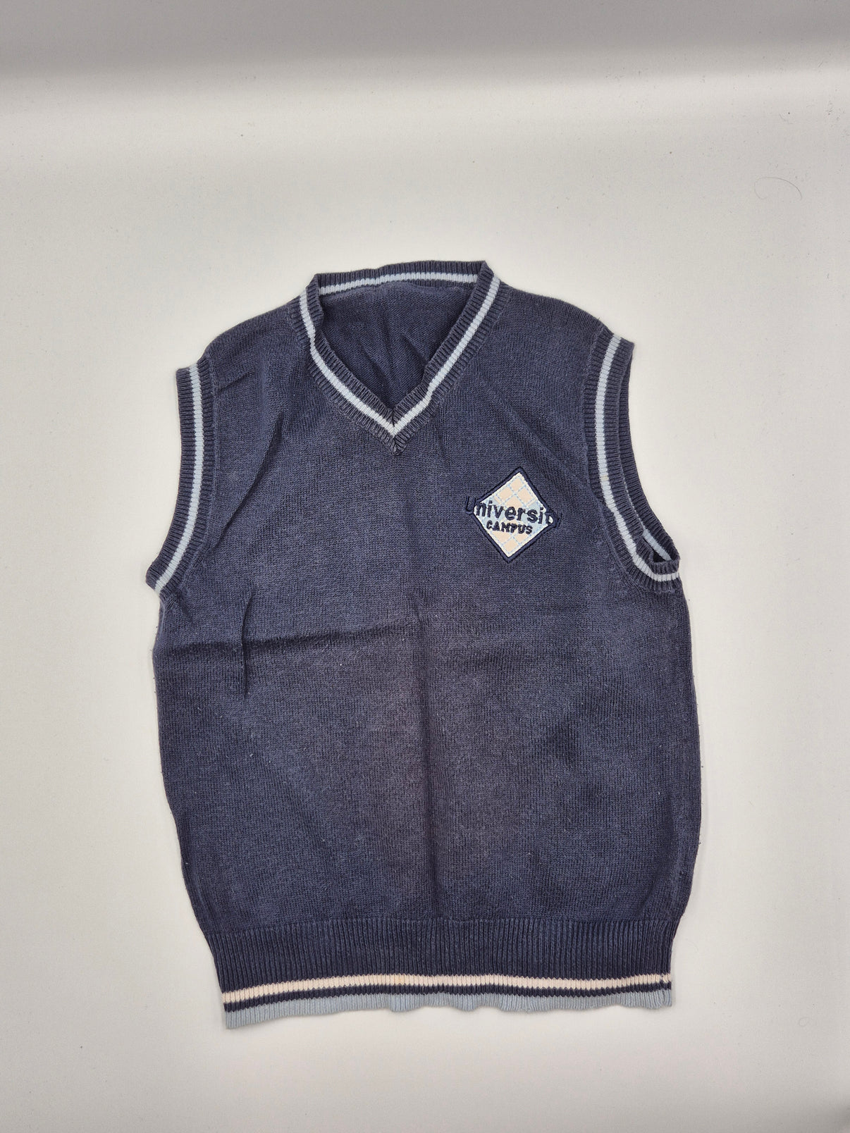 Pletená chlapecká vesta St. Bernard ve velikosti 104 je skvělým kouskem pro malého elegána. Má tmavě modrý až lehce ocelově modrý odstín, který působí nadčasově a snadno se kombinuje s košilí i tričkem. Lemování u výstřihu, rukávů a spodního okraje doplňují jemné proužky v bílé a světle šedé barvě, což vestě dodává školní a lehce slavnostní nádech.