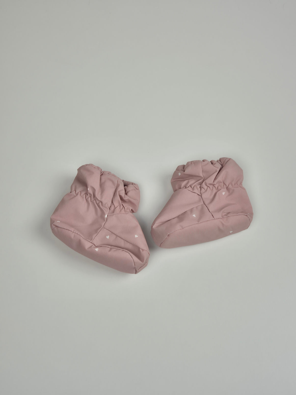 Praktické dětské capáčky v jemném starorůžovém odstínu s drobnými bílými srdíčky. Barva je něžná a hezky se hodí k holčičím zimním i přechodovým outfitům. Díky vodoodpudivému materiálu jsou ideální do kočárku nebo nosítka, kdy chrání nožičky před chladem a vlhkem.